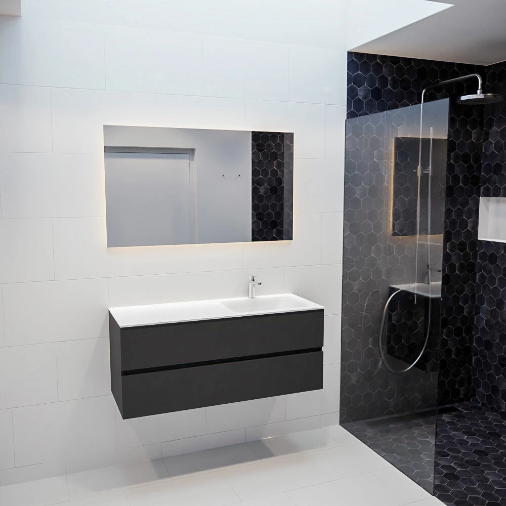 Dit prachtige hangende badkamermeubel van Mondiaz beschikt over een onderkast in de kleur dark grey met een wastafel van solid surface. De wastafel wordt geleverd met met 1 kraangat.