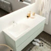 Dit prachtige hangende badkamermeubel van Mondiaz beschikt over een onderkast in de kleur talc met een wastafel van solid surface. De wastafel wordt geleverd met met 2 kraangaten.