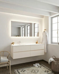 Dit prachtige hangende badkamermeubel van Mondiaz beschikt over een onderkast in de kleur linen met een wastafel van solid surface. De wastafel wordt geleverd met 1 kraangat.