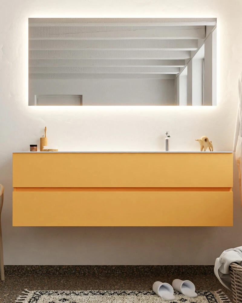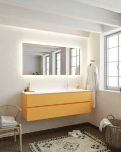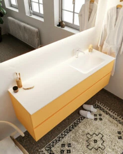 Dit prachtige hangende badkamermeubel van Mondiaz beschikt over een onderkast in de kleur ocher met een wastafel van solid surface. De wastafel wordt geleverd met 1 kraangat.