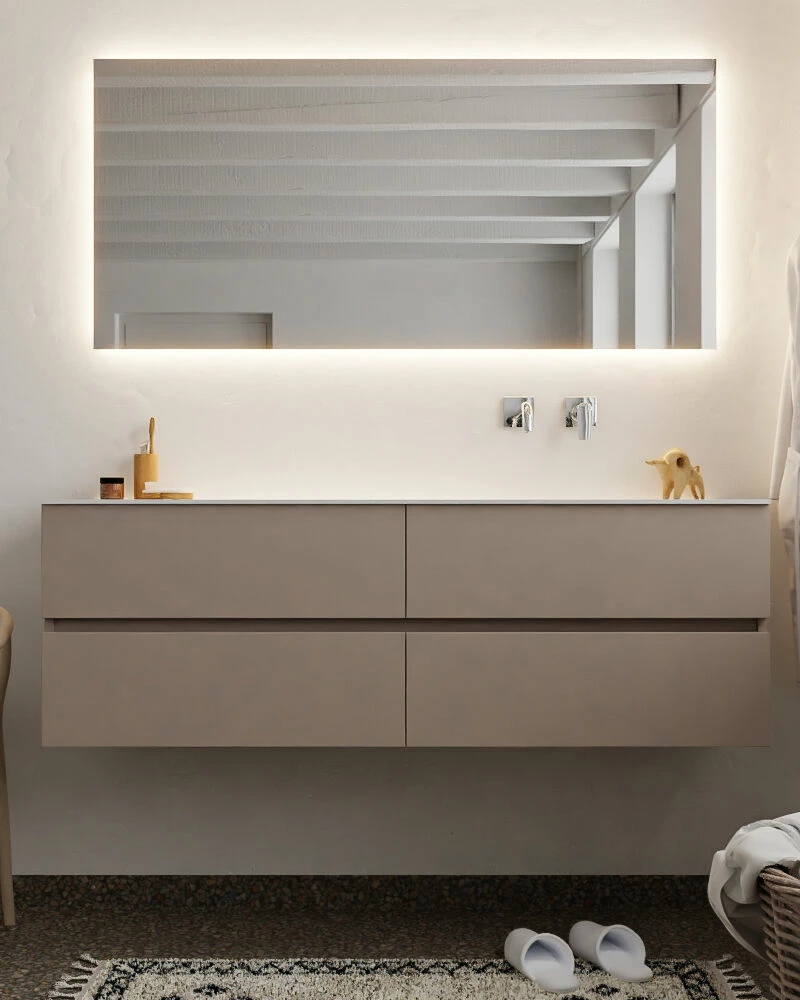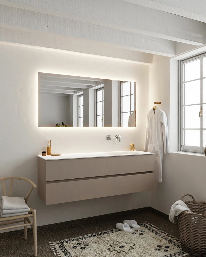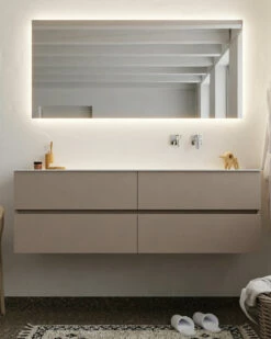Het badmeubel heeft een breedte van 150 cm, een hoogte van 50 cm en een diepte van 45 cm. De set is in meerdere afmetingen, verschillende kleuren beschikbaar.