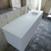 Dit prachtige hangende badkamermeubel van Mondiaz beschikt over een onderkast in de kleur greey met een wastafel van solid surface. De wastafel wordt geleverd met 0 kraangaten.