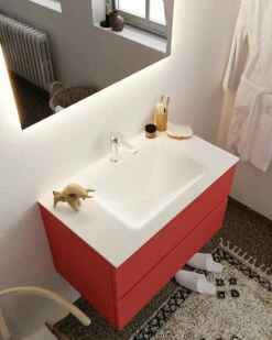Dit prachtige hangende badkamermeubel van Mondiaz beschikt over een onderkast in de kleur fire met een wastafel van solid surface. De wastafel wordt geleverd met 1 kraangat.
