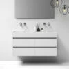 Dit badkamermeubel van Muebles combineert esthetiek en functionaliteit! Het meubel heeft een strak en stijlvol design en is beschikbaar in drie neutrale kleuren die in elke badkamerstijl passen. De matte kleur geeft het meubel daarnaast een geraffineerde en luxe uitstraling. Het meubel is strak afgewerkt en de vier lades vallen feilloos in het meubel weg. Door het zogenoemde ‘push to open’-systeem is het zeer eenvoudig om met een lichte druk de lades open en dicht te doen. Het meubel komt inclusief een organizer voor de lade, zodat je spulletjes goed kan opbergen. Daarnaast is het meubel voorzien van een porseleinen wastafel met twee wasbakken en kraangaten. Combineer dit badkamermeubel met de Ideal kolomkast of ga voor de gehele Ideal set (badkamermeubel, spiegel en spiegellamp) om het plaatje compleet te maken. Deze zijn te vinden onder de toebehoren.