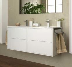 Dit badkamermeubel van Muebles combineert esthetiek en functionaliteit! Het meubel heeft een strak en stijlvol design en is beschikbaar in drie neutrale kleuren die in elke badkamerstijl passen. De matte kleur geeft het meubel daarnaast een geraffineerde en luxe uitstraling. Het meubel is strak afgewerkt en de vier lades vallen feilloos in het meubel weg. Door het zogenoemde ‘push to open’-systeem is het zeer eenvoudig om met een lichte druk de lades open en dicht te doen. Het meubel komt inclusief een organizer voor de lade, zodat je spulletjes goed kan opbergen. Daarnaast is het meubel voorzien van een porseleinen wastafel met twee wasbakken en kraangaten. Combineer dit badkamermeubel met de Ideal kolomkast of ga voor de gehele Ideal set (badkamermeubel, spiegel en spiegellamp) om het plaatje compleet te maken. Deze zijn te vinden onder de toebehoren.