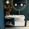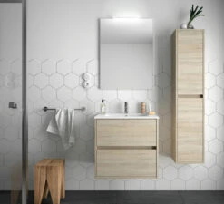 Maak het meubel compleet met een bijpassende badkamerkast en spiegel.