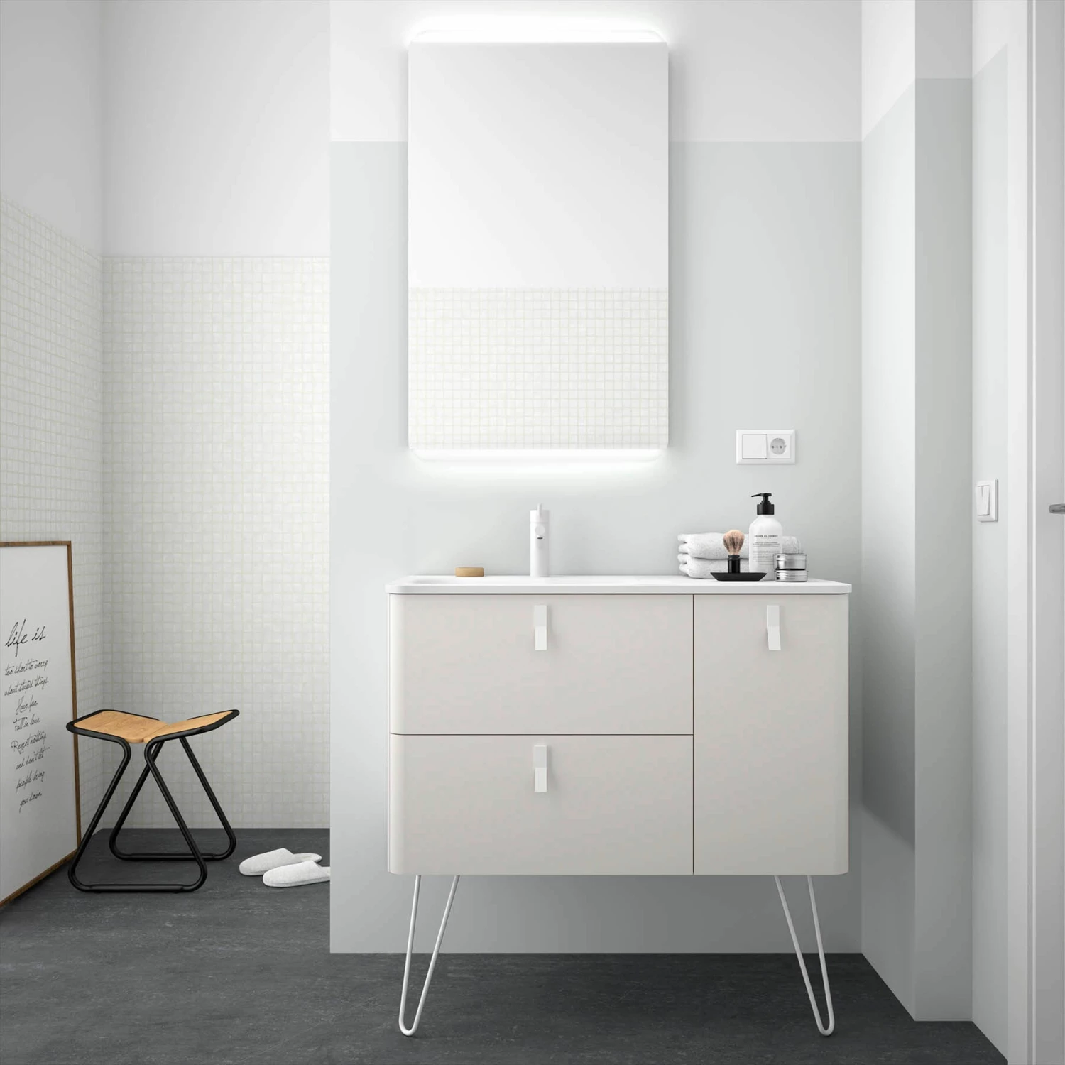Dit badkamermeubel is uitgevoerd met een witte wastafel en een beige onderkast voorzien van witte grepen. De onderkast kan zowel staand als aan de wand gemonteerd worden. De witte pootjes worden automatisch meegeleverd. De set wordt zonder spiegel geleverd.