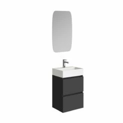 Dit Mueller Minus is goed geschikt voor de kleine badkamers. Door dit mat zwarte en ruimtebesparende badmeubel van 45cm creër je nieuw élan in je badkamer! Bovendien is de onderkast voorzien van 2 softclose laden en is inclusief ovale spiegel.