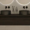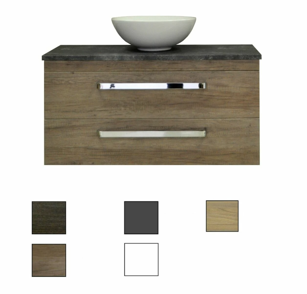 Het badkamermeubel is voorzien van twee soft-close laden van het bekende merk ‘Blum’. De laden sluiten geruisloos en zijn afgewerkt met een stijlvolle chromen greep. Het black-stone look topblad is voorzien van een keramische waskom.