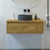 Het badkamermeubel is voorzien van twee soft-close laden van het bekende merk ‘Blum’. De laden sluiten geruisloos en zijn afgewerkt met een stijlvolle chromen greep. Het black-stone look topblad is voorzien van een keramische waskom.