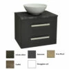 Het badkamermeubel is voorzien van twee soft-close laden van het bekende merk ‘Blum’. De laden sluiten geruisloos en zijn afgewerkt met een stijlvolle chromen greep. Het black-stone look topblad is voorzien van een keramische waskom.