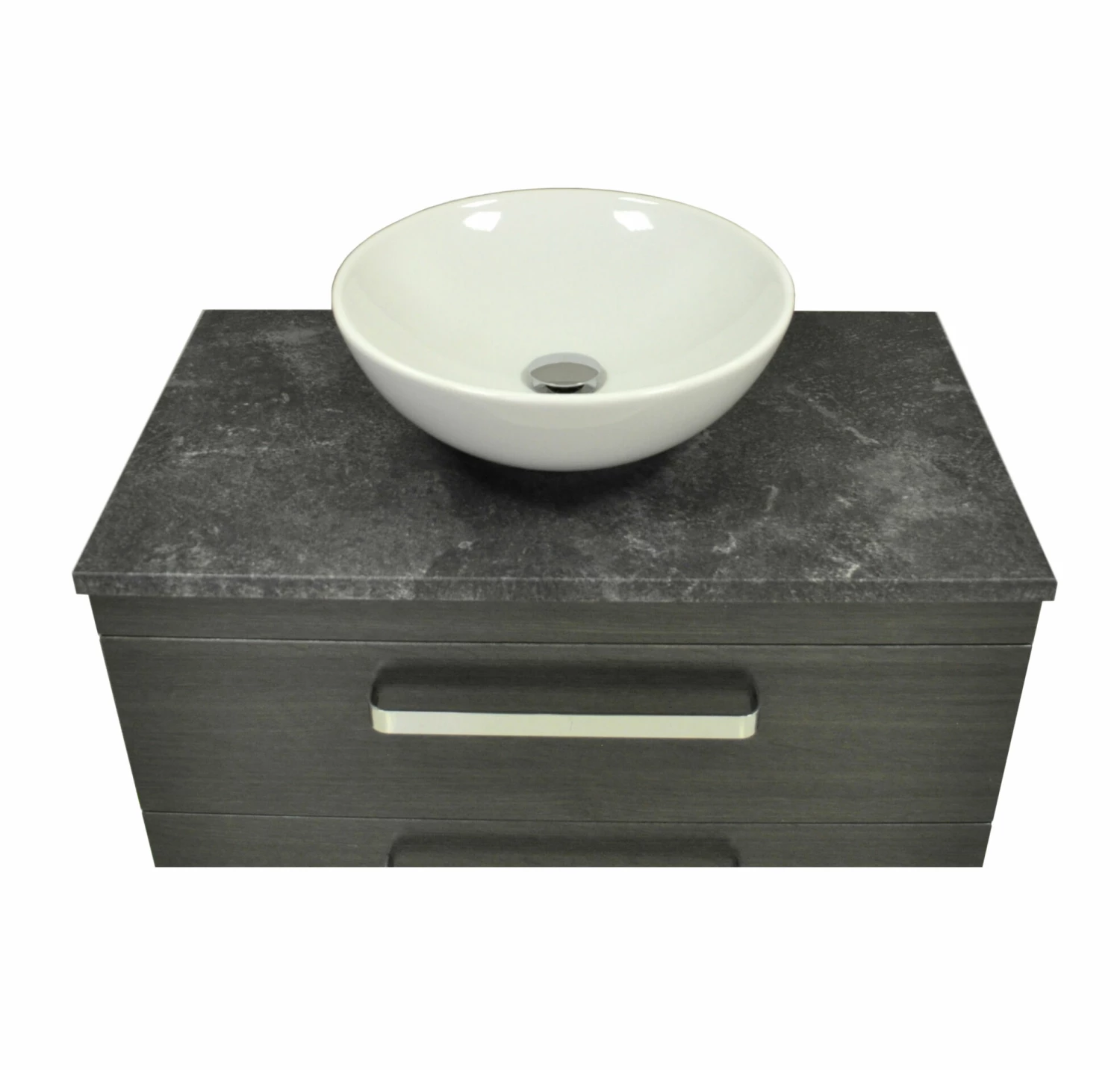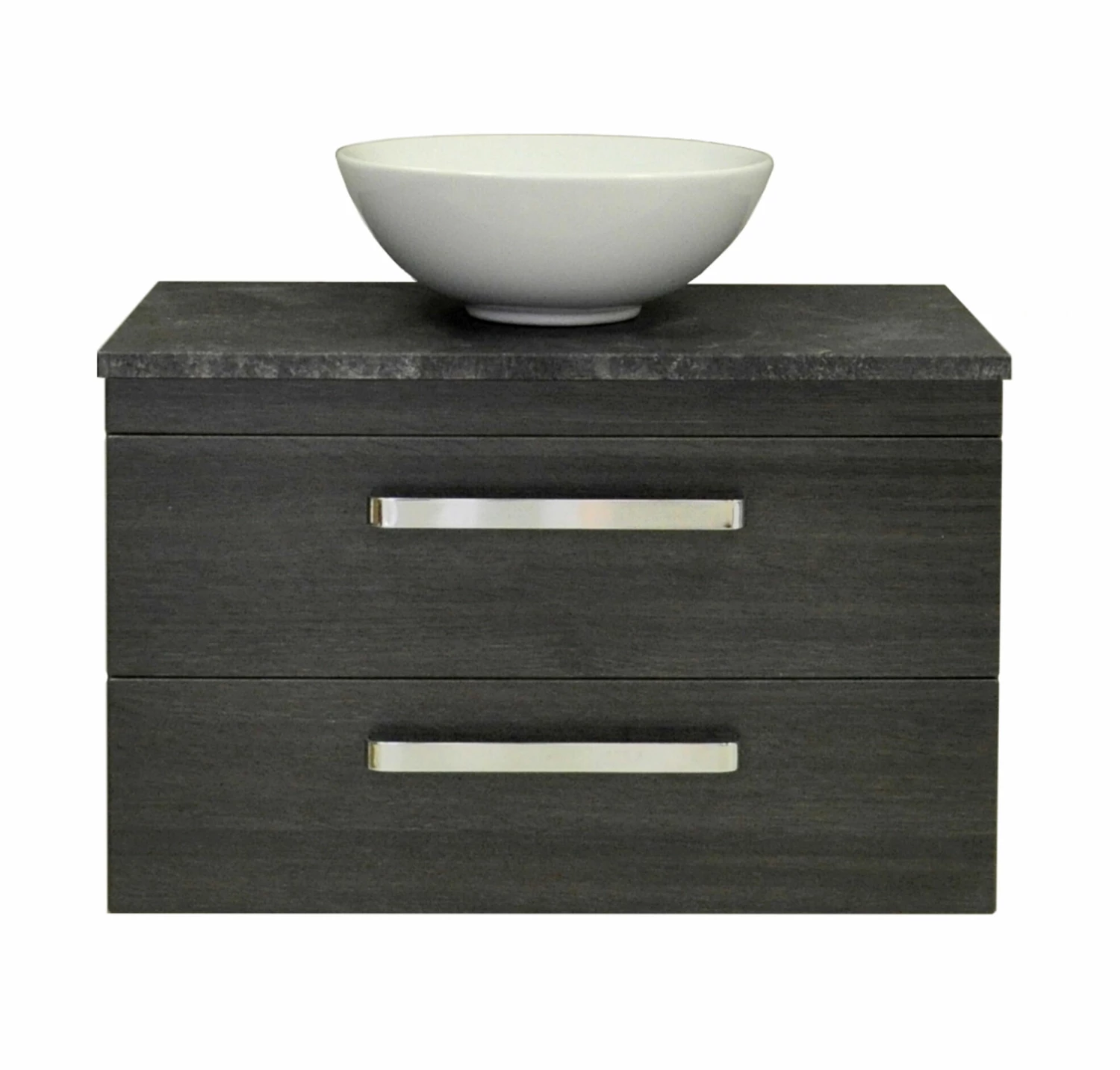 Het badkamermeubel is voorzien van twee soft-close laden van het bekende merk ‘Blum’. De laden sluiten geruisloos en zijn afgewerkt met een stijlvolle chromen greep. Het black-stone look topblad is voorzien van een keramische waskom.