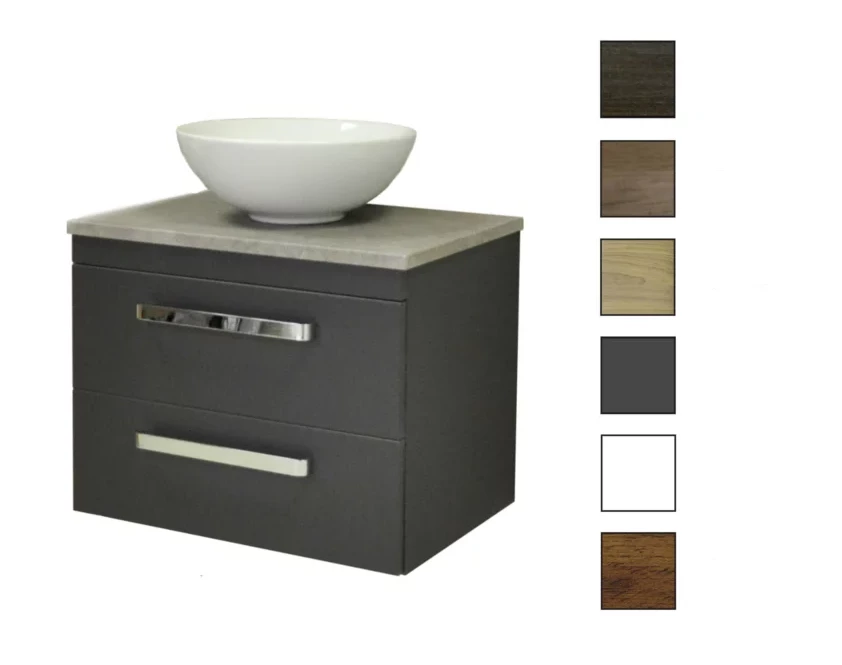 Het badkamermeubel is voorzien van twee soft-close laden van het bekende merk ‘Blum’. De laden sluiten geruisloos en zijn afgewerkt met een stijlvolle chromen greep. Het grey-stone look topblad is voorzien van een keramische waskom.