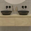 Het badkamermeubel is voorzien van twee soft-close laden van het bekende merk ‘Blum’. De laden sluiten geruisloos en zijn afgewerkt met een stijlvolle chromen greep. Het grey-stone look topblad is voorzien van een keramische waskom.