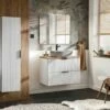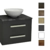 Het badkamermeubel is voorzien van twee soft-close laden van het bekende merk ‘Blum’. De laden sluiten geruisloos en zijn afgewerkt met een stijlvolle chromen greep. Het grey-stone look topblad is voorzien van een keramische waskom.