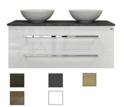 Het badkamermeubel is voorzien van twee soft-close laden van het bekende merk ‘Blum’. De laden sluiten geruisloos en zijn afgewerkt met een stijlvolle chromen greep. Het grey-stone look topblad is voorzien van een keramische waskom.