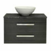 Het badkamermeubel is voorzien van twee soft-close laden van het bekende merk ‘Blum’. De laden sluiten geruisloos en zijn afgewerkt met een stijlvolle chromen greep. Het grey-stone look topblad is voorzien van een keramische waskom.