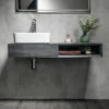 Het badkamermeubel is voorzien van twee soft-close laden van het bekende merk ‘Blum’. De laden sluiten geruisloos en zijn afgewerkt met een stijlvolle chromen greep. Het grey-stone look topblad is voorzien van een keramische waskom.