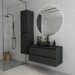 Het badkamermeubel is voorzien van twee soft-close laden van het bekende merk ‘Blum’. De laden sluiten geruisloos en zijn afgewerkt met een stijlvolle chromen greep. Het grey-stone look topblad is voorzien van een keramische waskom.