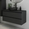 Het badkamermeubel is voorzien van twee soft-close laden van het bekende merk ‘Blum’. De laden sluiten geruisloos en zijn afgewerkt met een stijlvolle chromen greep. Het grey-stone look topblad is voorzien van een keramische waskom.