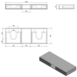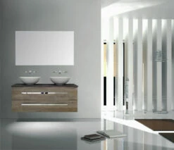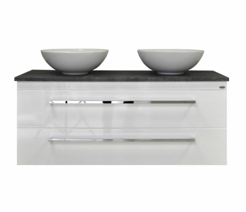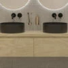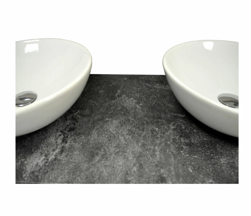 Het badkamermeubel is voorzien van twee soft-close laden van het bekende merk ‘Blum’. De laden sluiten geruisloos en zijn afgewerkt met een stijlvolle chromen greep. Het black-stone look topblad is voorzien van twee keramische waskommen.