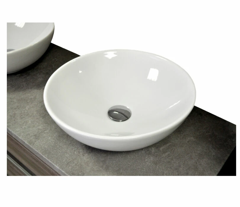 Het badkamermeubel is voorzien van twee soft-close laden van het bekende merk ‘Blum’. De laden sluiten geruisloos en zijn afgewerkt met een stijlvolle chromen greep. Het grey-stone look topblad is voorzien van twee keramische waskommen.