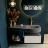 Het badkamermeubel is voorzien van drie soft-close laden van het bekende merk ‘Blum’. De laden sluiten geruisloos en zijn voorzien van een stijlvolle RVS greep. De keramische wastafel is uitgevoerd met een universeel kraangat.