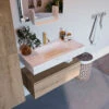 Wil jij een uniek meubel in de badkamer? Kies dan voor een halfrond model. De voorkant van dit meubel heeft een natuurlijke uitstraling door zijn ronding. Het meubel is voorzien van een mineraalmarmer wastafel met 1 kraangat. De handvaten zijn gemaakt van RVS, dit is geborsteld voor een mooie look!