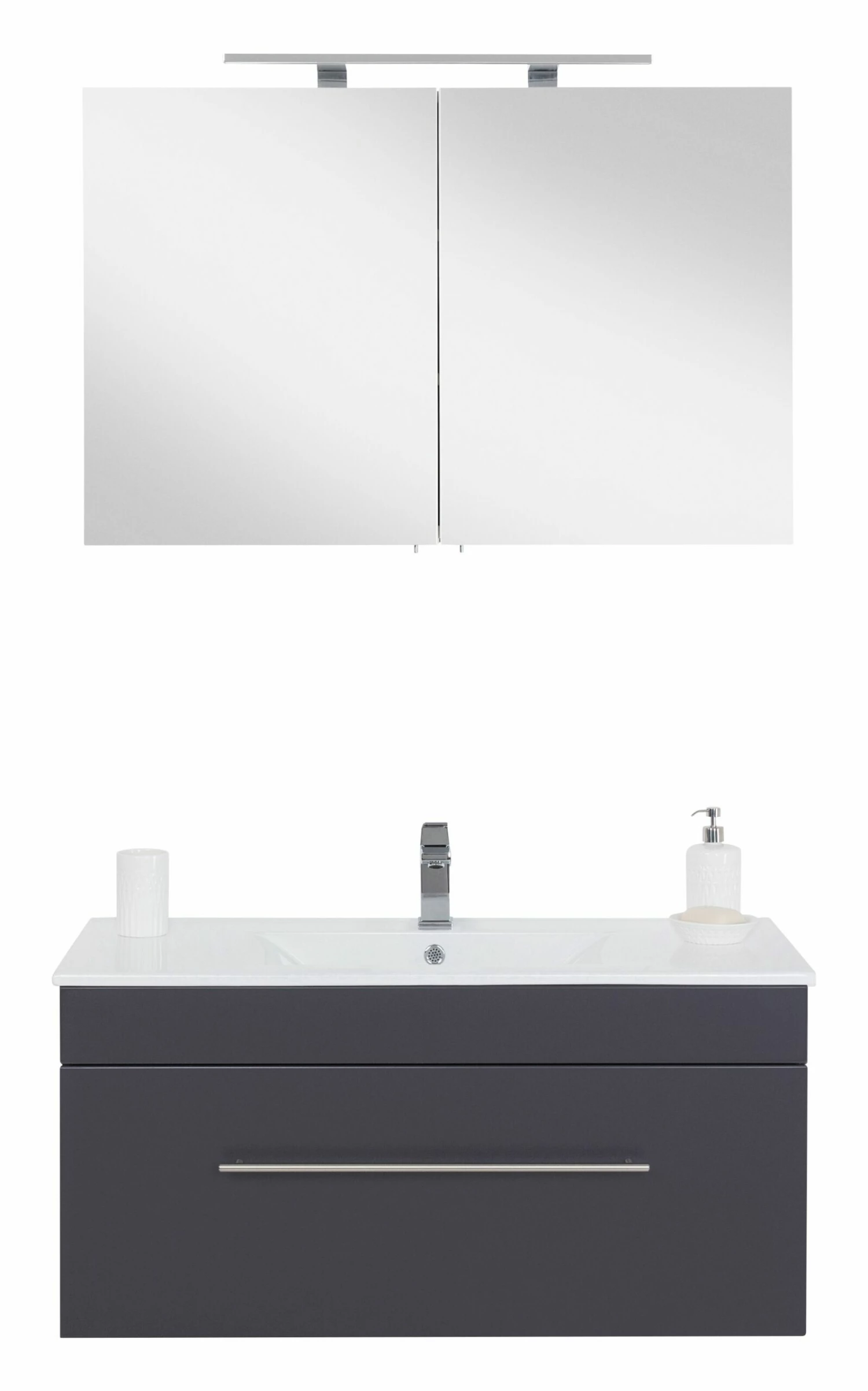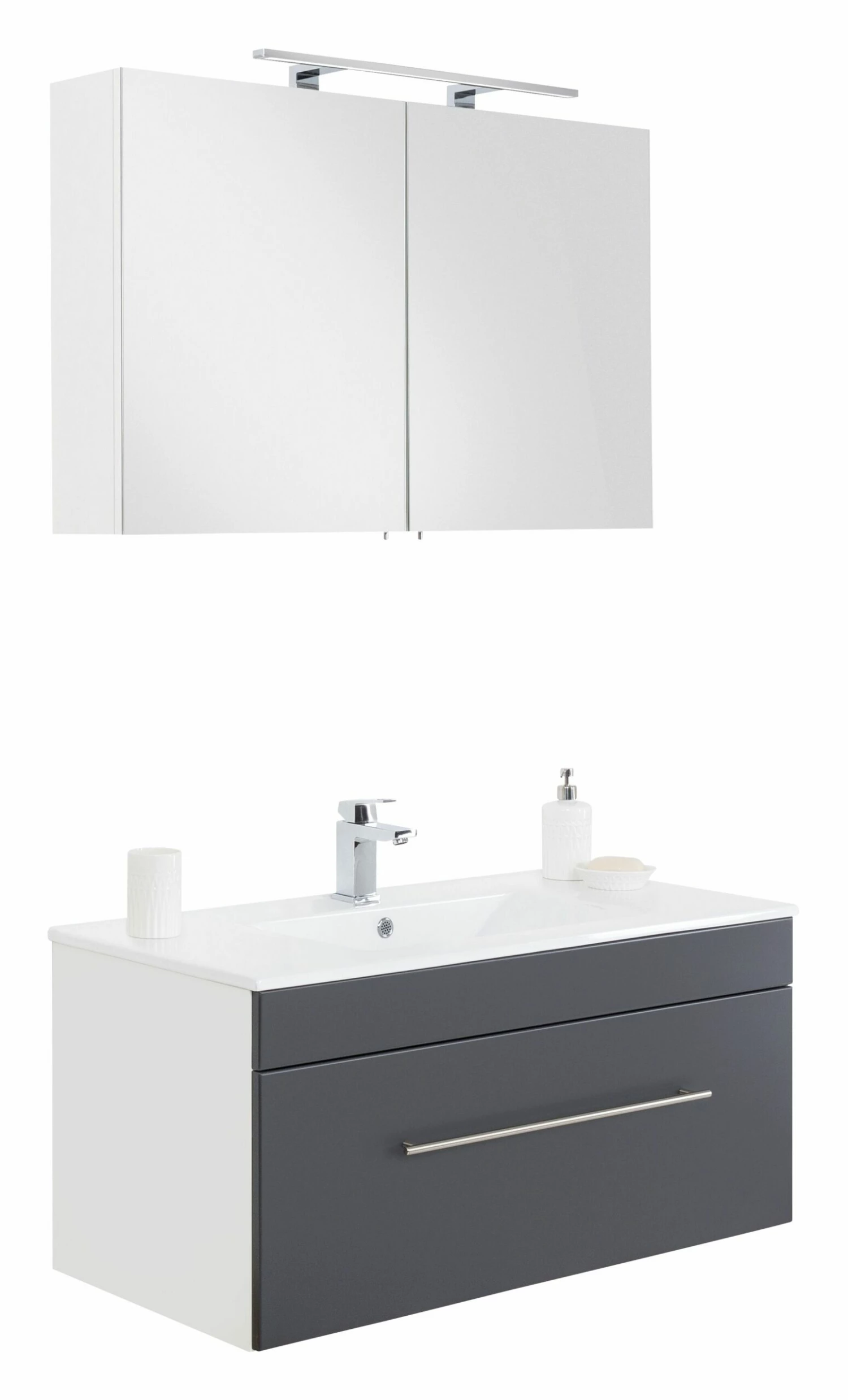 Opbergruimte zat in deze set. In het meubel zit 1 ruime lade verwerkt en de spiegelkast beschikt over 2 deuren. In de kast vind je 2 legplanken. Binnenin de spiegelkast zit een stopcontact en een lichtknop.