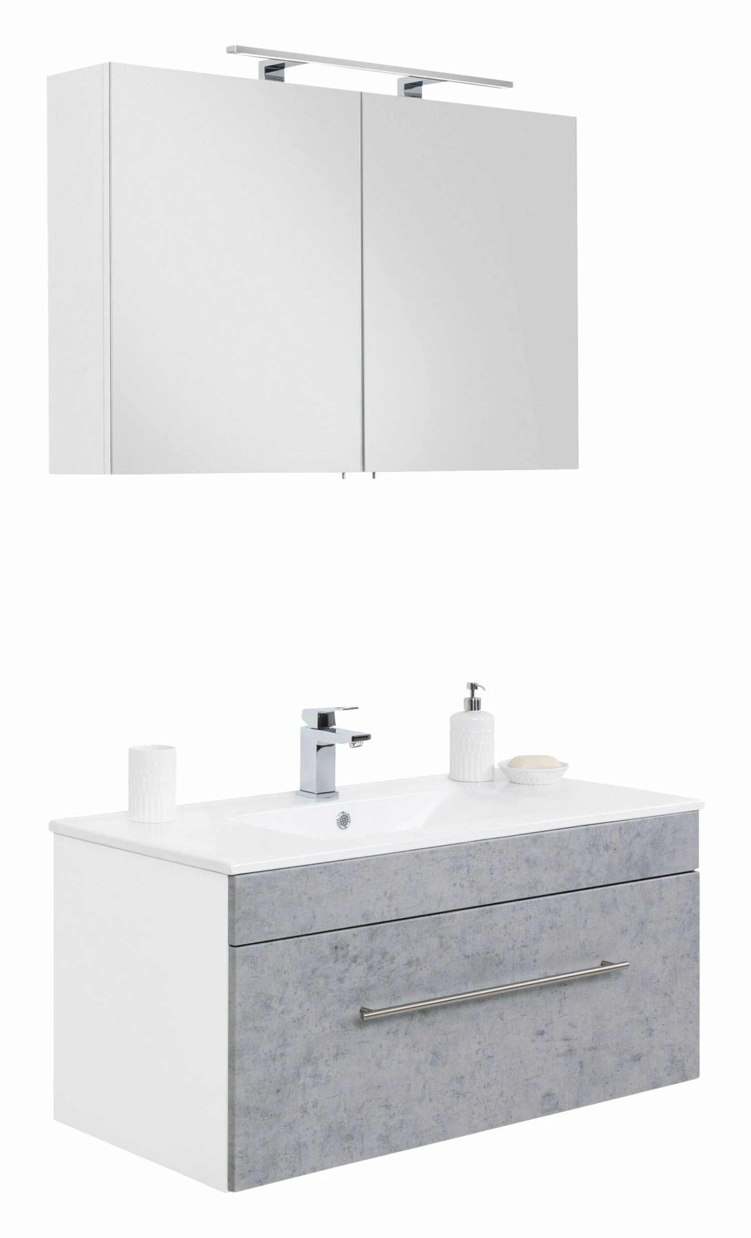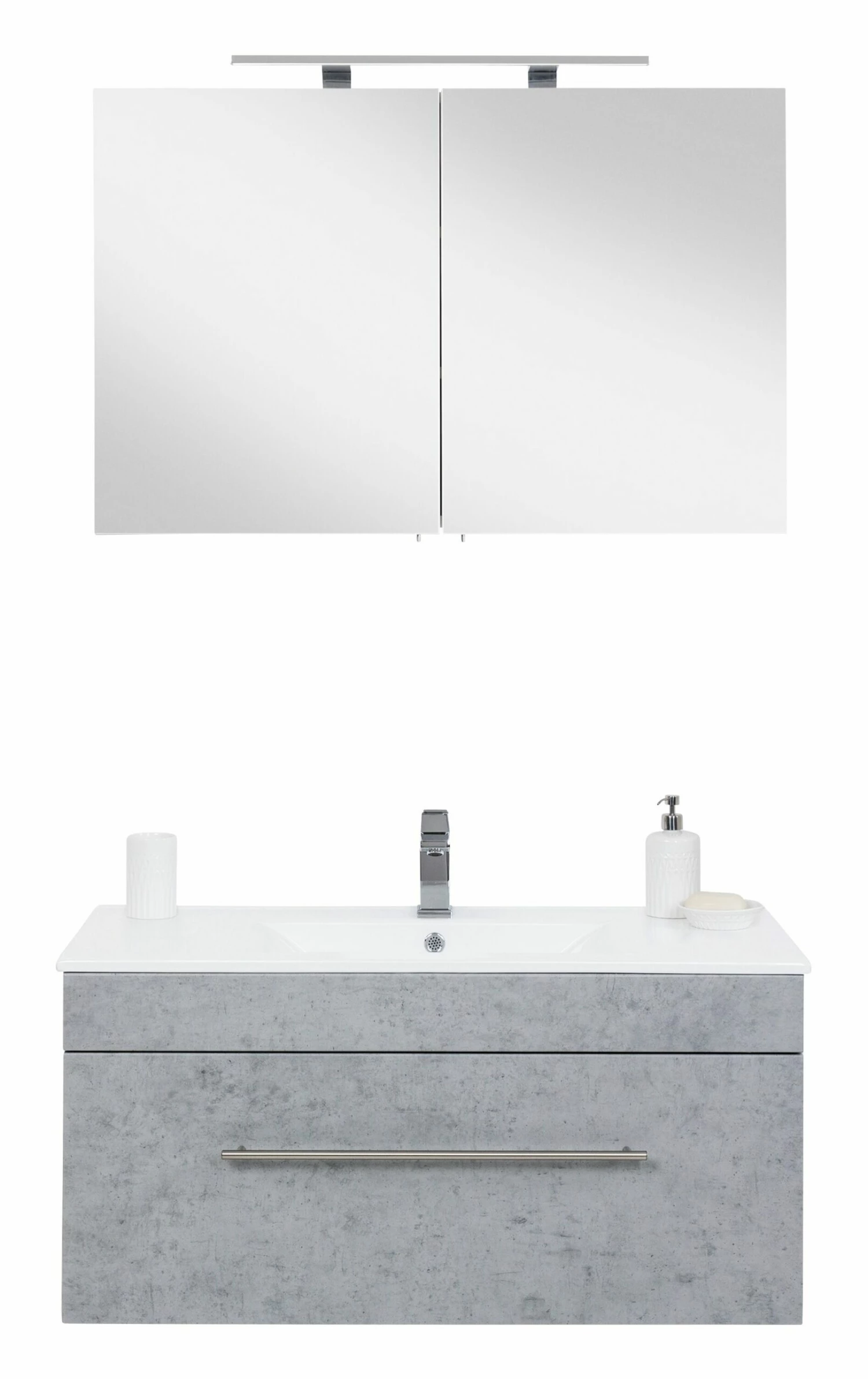 Opbergruimte zat in deze set. In het meubel zit 1 ruime lade verwerkt en de spiegelkast beschikt over 2 deuren. In de kast vind je 2 legplanken. Binnenin de spiegelkast zit een stopcontact en een lichtknop.