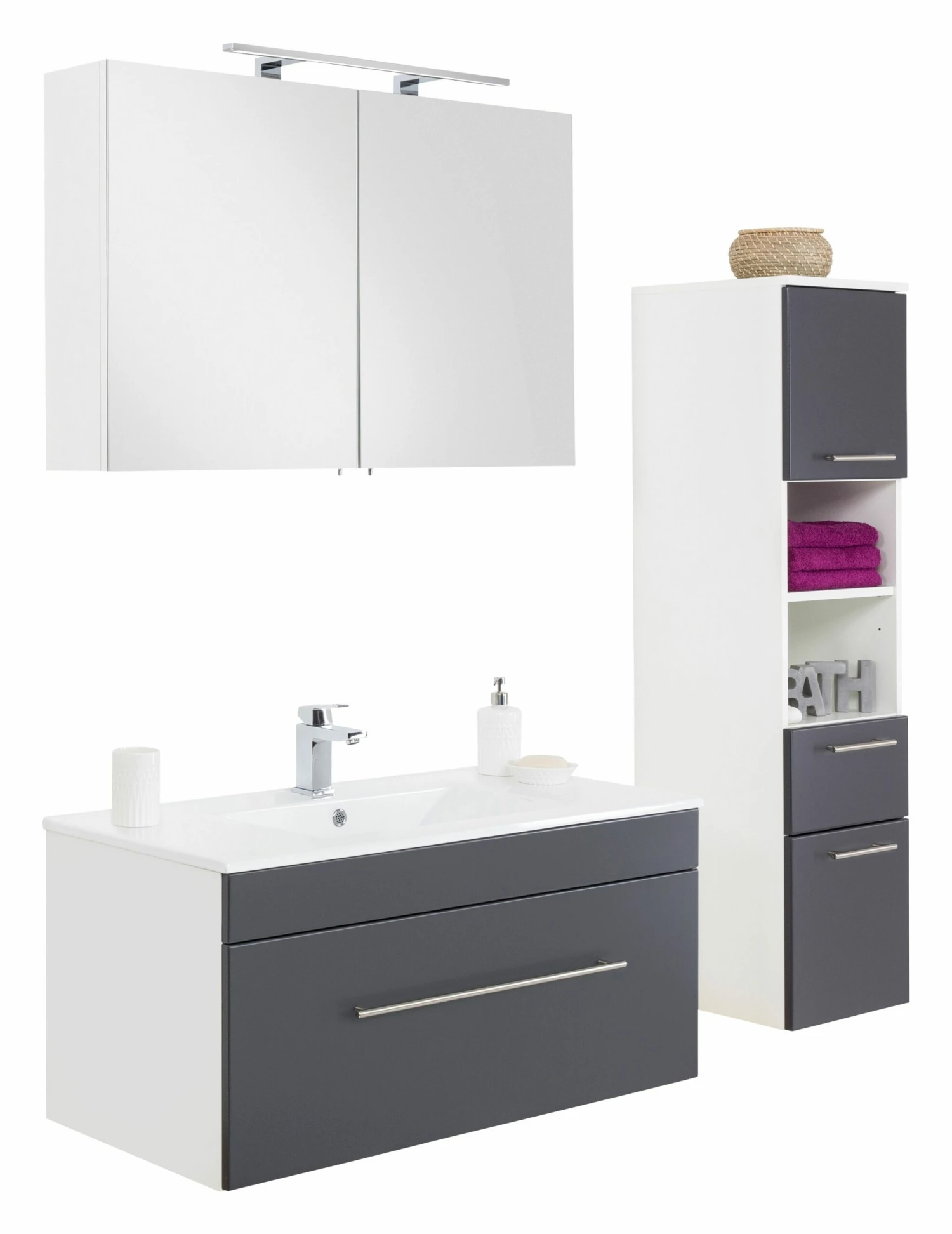 Opbergruimte zat in deze set. In het meubel zit 1 ruime lade verwerkt en de spiegelkast beschikt over 2 deuren. In de spiegelkast vind je 2 legplanken. Daarnaast biedt de kolomkast extra ruimte met 2 deuren, een lade en een open opbergvak. Binnenin de spiegelkast zit een stopcontact en een lichtknop.