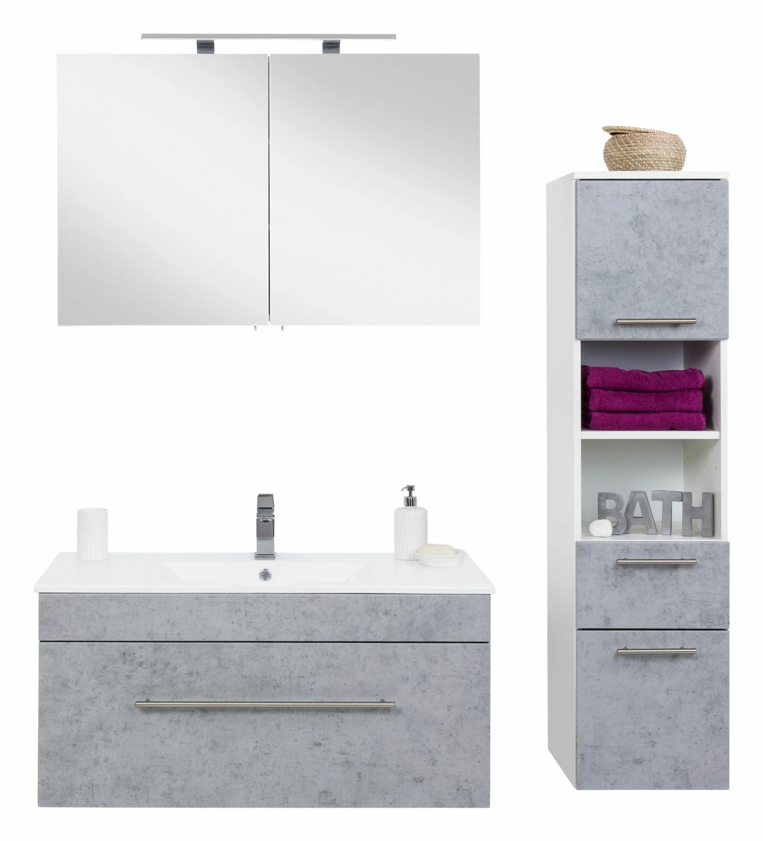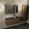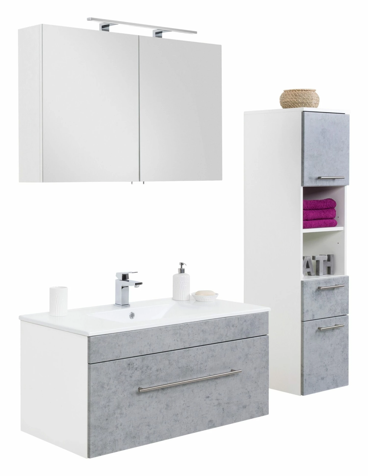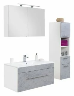 Opbergruimte zat in deze set. In het meubel zit 1 ruime lade verwerkt en de spiegelkast beschikt over 2 deuren. In de spiegelkast vind je 2 legplanken. Daarnaast biedt de kolomkast extra ruimte met 2 deuren, een lade en een open opbergvak. Binnenin de spiegelkast zit een stopcontact en een lichtknop.
