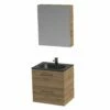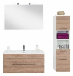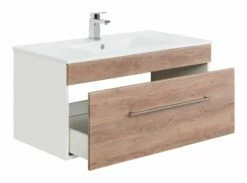 Opbergruimte zat in deze set. In het meubel zit 1 ruime lade verwerkt en de spiegelkast beschikt over 2 deuren. In de spiegelkast vind je 2 legplanken. Daarnaast biedt de kolomkast extra ruimte met 2 deuren, een lade en een open opbergvak. Binnenin de spiegelkast zit een stopcontact en een lichtknop.