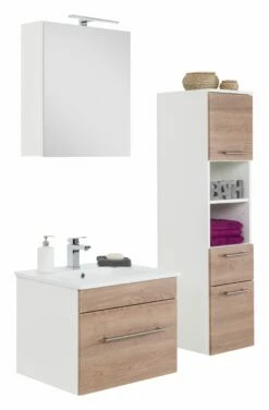 Opbergruimte zat in deze set. In het meubel zit 1 ruime lade verwerkt en de spiegelkast beschikt over 1 deur. In de spiegelkast vind je 2 legplanken. Daarnaast biedt de kolomkast extra ruimte met 2 deuren, een lade en een open opbergvak. Binnenin de spiegelkast zit een stopcontact en een lichtknop.