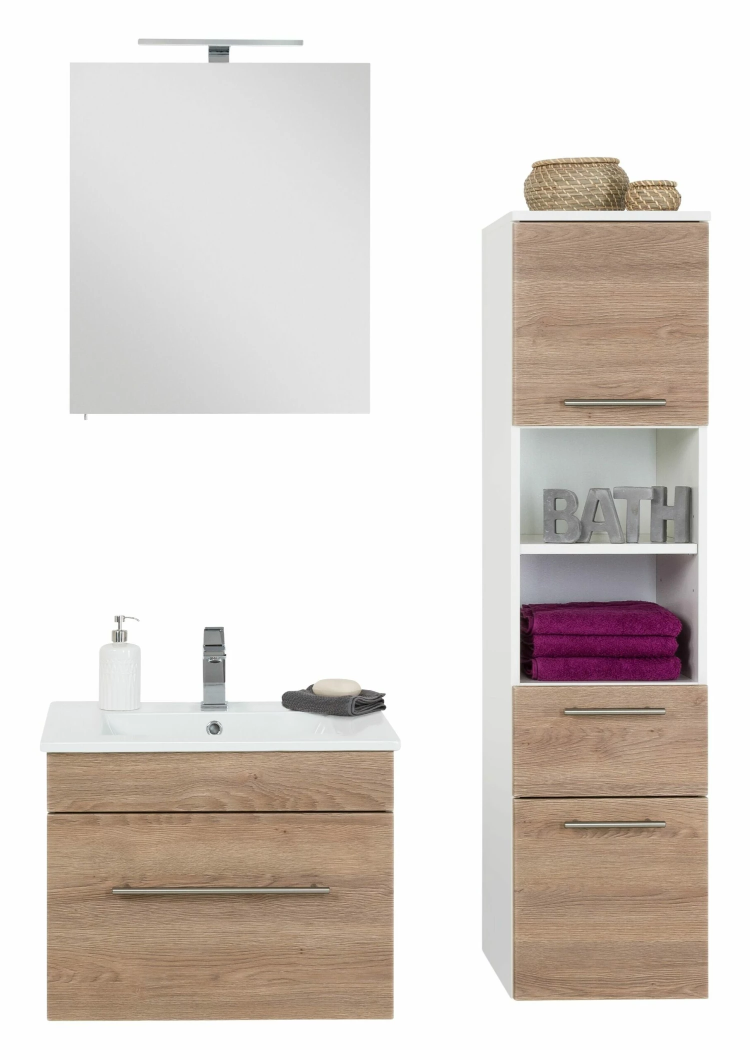 Het meubel in deze set is 60cm breed en gemaakt van mdf. De wastafel is gemaakt van keramiek, een uitstekende keuze in de badkamer! De bijpassende spiegelkast is 55cm breed. Bij de spiegelkast wordt een LED lamp geleverd, zo heb je altijd voldoende licht bij je meubel!