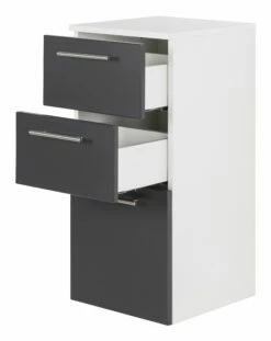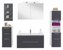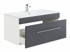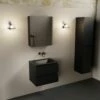 Opbergruimte zat in deze set. In het meubel zit 1 ruime lade verwerkt en de spiegelkast beschikt over 2 deuren. In de spiegelkast vind je 2 legplanken. Daarnaast biedt de kolomkast extra ruimte met 2 deuren, een lade en een open opbergvak. De lage kolomkast heeft 2 lades en 1 deur. Binnenin de spiegelkast zit een stopcontact en een lichtknop.