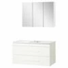Het meubel in deze set is 100cm breed en gemaakt van mdf. De wastafel is gemaakt van mineraalmarmer, een uitstekende keuze in de badkamer! De bijpassende spiegelkast heeft dezelfde breedte. Bij de spiegelkast wordt een LED lamp geleverd, zo heb je altijd voldoende licht bij je meubel! Naast verlichting op je spiegel vind je ook subtiele verlichting achter de glazen planchetten op de open kast.Â