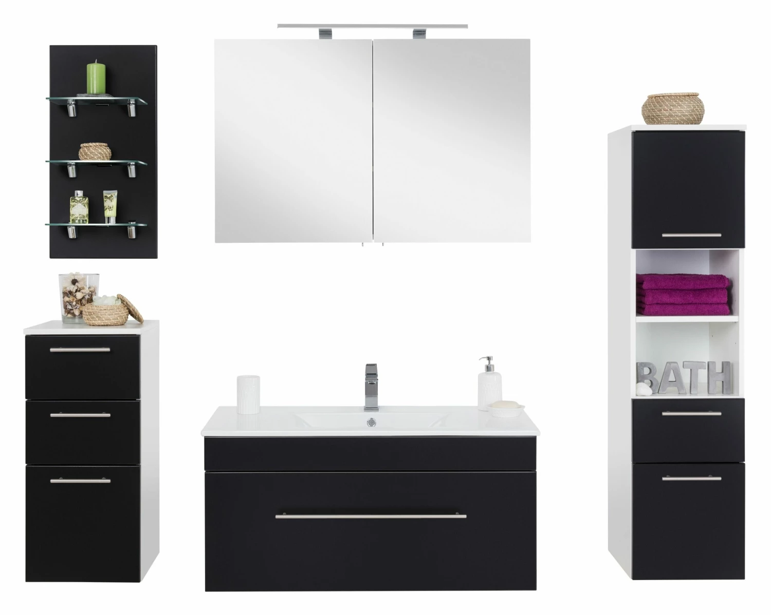 Opbergruimte zat in deze set. In het meubel zit 1 ruime lade verwerkt en de spiegelkast beschikt over 2 deuren. In de spiegelkast vind je 2 legplanken. Daarnaast biedt de kolomkast extra ruimte met 2 deuren, een lade en een open opbergvak. De lage kolomkast heeft 2 lades en 1 deur.Â
