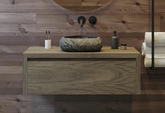De Alvares badmeubels zijn gemaakt van gefineerd eiken, wat vooral handig is in vochtige ruimtes als een badkamer. Het heeft de uitstraling van massief hout, maar kromt niet en is een stuk onderhoudsvriendelijker.