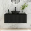 De Raja waskom is afgewerkt met een nano-coating. Deze innovatieve vinding zorgt voor extra hygiëne en is zeer eenvoudig te onderhouden. Vloeistoffen kunnen zich niet hechten aan het oppervlak en worden omgezet in pareltjes. Deze rollen automatisch richting de afvoer. Vuil en kalk maken geen kans en worden direct weggespoeld. Met deze technologie houdt u het oppervlak optimaal schoon en fris. De kleur van de waskom is mat zwart, wat mooi past bij de kleur van het meubel. De kom heeft een breedte van 40cm en een hoogte van 13cm.