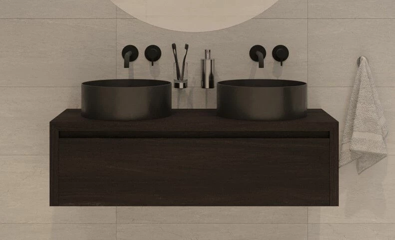 De Alvares badmeubels zijn gemaakt van gefineerd eiken, wat vooral handig is in vochtige ruimtes als een badkamer. Het heeft de uitstraling van massief hout, maar kromt niet en is een stuk onderhoudsvriendelijker.