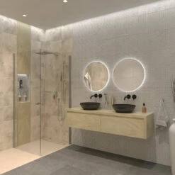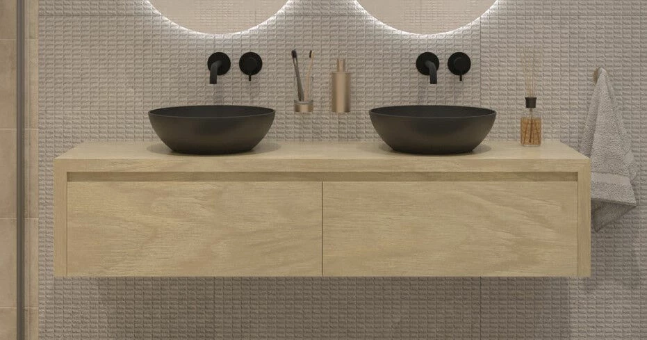 De Alvares badmeubels zijn gemaakt van gefineerd eiken, wat vooral handig is in vochtige ruimtes als een badkamer. Het heeft de uitstraling van massief hout, maar kromt niet en is een stuk onderhoudsvriendelijker.