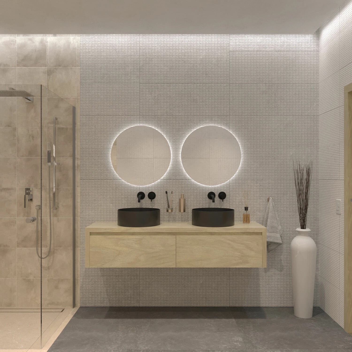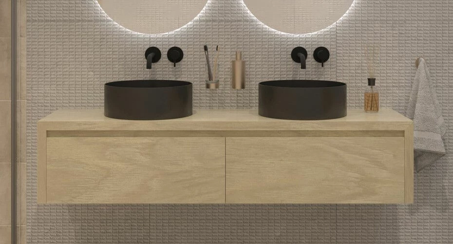 De Alvares badmeubels zijn gemaakt van gefineerd eiken, wat vooral handig is in vochtige ruimtes als een badkamer. Het heeft de uitstraling van massief hout, maar kromt niet en is een stuk onderhoudsvriendelijker.