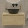 De Alvares badmeubels zijn gemaakt van gefineerd eiken, wat vooral handig is in vochtige ruimtes als een badkamer. Het heeft de uitstraling van massief hout, maar kromt niet en is een stuk onderhoudsvriendelijker.