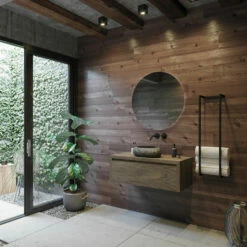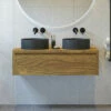 De Alvares badmeubels zijn gemaakt van gefineerd eiken, wat vooral handig is in vochtige ruimtes als een badkamer. Het heeft de uitstraling van massief hout, maar kromt niet en is een stuk onderhoudsvriendelijker.