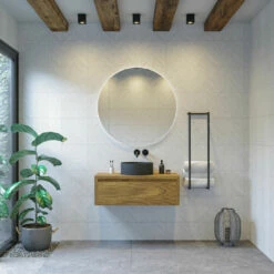 De Alvares badmeubels zijn gemaakt van gefineerd eiken, wat vooral handig is in vochtige ruimtes als een badkamer. Het heeft de uitstraling van massief hout, maar kromt niet en is een stuk onderhoudsvriendelijker.