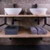 Gebruik de massieve planken om een badkamermeubel te maken, plaats op de planken 1 of 2 waskommen. Je monteert de planken met de beugels die onder de toebehoren staan.