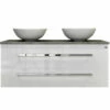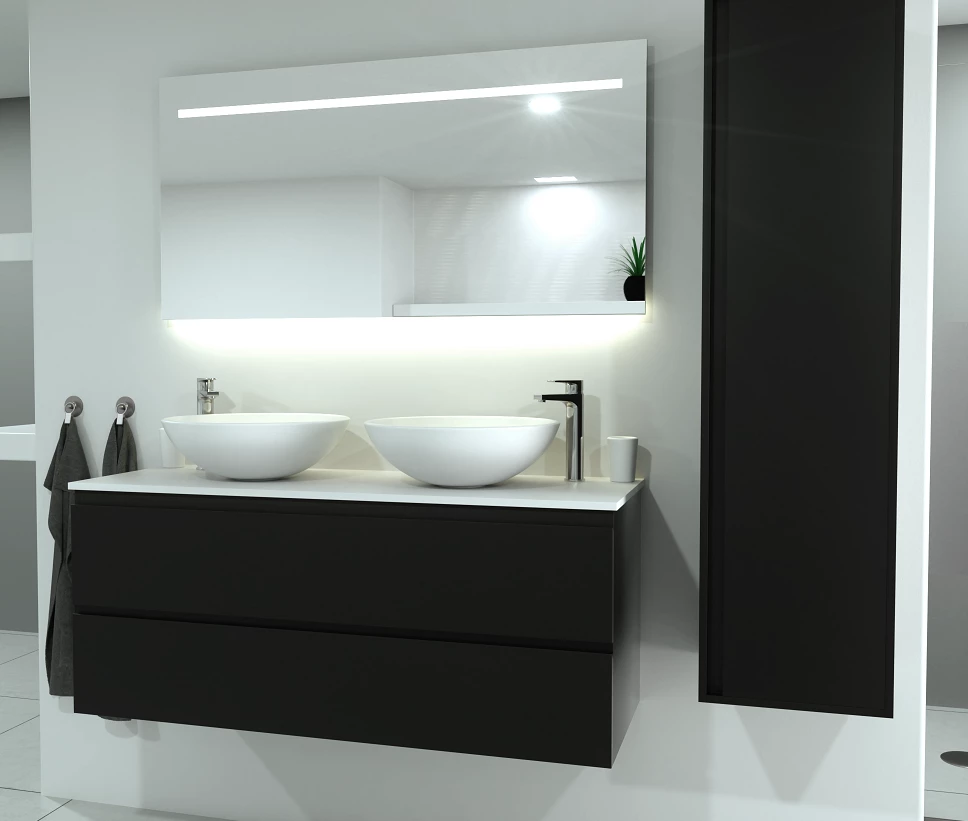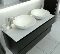 Boven op de onderkast komt een plaat te liggen die gemaakt is van solid surface. Dit materiaal is mat wit van kleur. Daarop worden de waskommen geplaatst. Deze zijn uiteraard gemaakt van hetzelfde materiaal en komen netjes overeen qua kleur. In het blad zijn nog geen gaten gecreëerd, dit dient u zelf aan te brengen tijdens installatie. Hierdoor heeft u ook de mogelijkheid om te kiezen voor een opbouw- of inbouw wastafelkraan. Tevens kunnen de kommen asymmetrisch geplaatst worden indien gewenst.