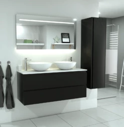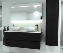 Het badkamermeubel Sally is verkrijgbaar in meerdere kleuren, maar de trend van nu is toch wel mat zwart. De onderkast is uitgevoerd met 2 lades die beschikken over een softclose sluiting. De lades zijn greeploos afgewerkt, zodat het geheel rustig en modern oogt.