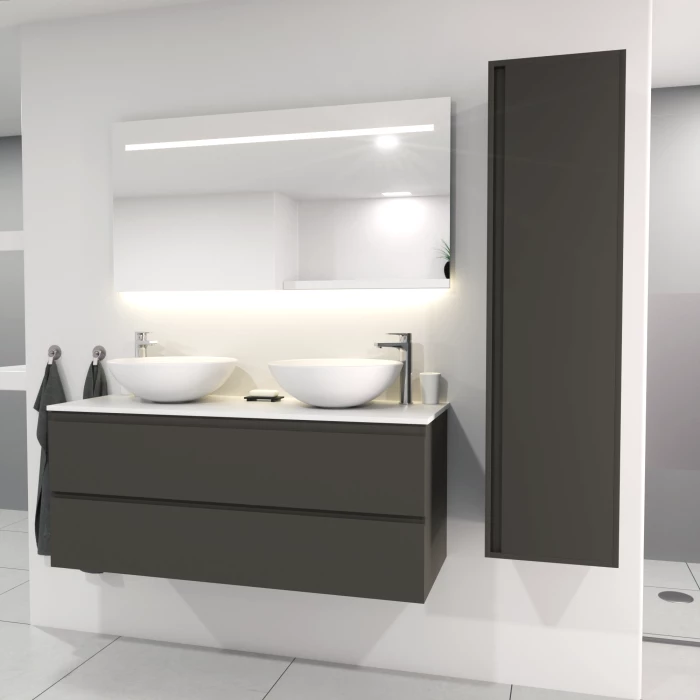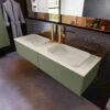 Boven op de onderkast komt een plaat te liggen die gemaakt is van solid surface. Dit materiaal is mat wit van kleur. Daarop worden de waskommen geplaatst. Deze zijn uiteraard gemaakt van hetzelfde materiaal en komen netjes overeen qua kleur. In het blad zijn nog geen gaten gecreëerd. Je kan er zelf voor kiezen om kraangaten te boren in het topblad. Zo kan je kiezen of je voor een staande of een inbouw wastafelkraan gaat. Ook zitten er nog geen afvoergaten in het blad, zodat je zelf kan bepalen waar de waskommen komen. Leuk hé?